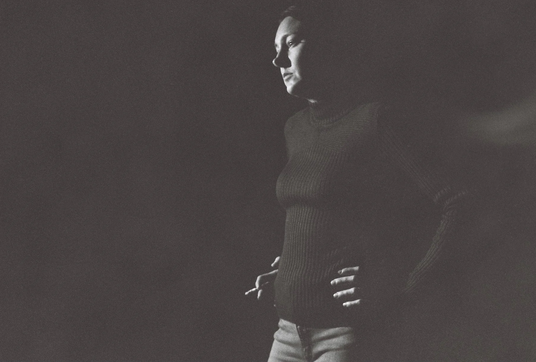The series explores the body as a record of time. The images are concerned with presence, repetition, and the quiet marks of endurance. Shot in a controlled environment with a single Fresnel source. The subject stands against a plain wall, partially lit, holding a cigarette without gesture or performance. Fixed camera. Only minor shifts in posture. Nothing is dramatized.